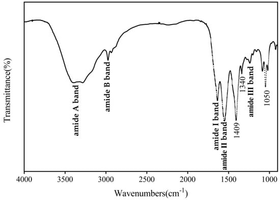 The FT-IR spectra of CHC (Figure 2) showed that the characteristic frequency region of its FT-IR spectrum was from 3500 to 1350 cm−1, which was due to the many distinctive vibrational modes or group frequencies of the amide groups within the protein molecule [27]. The FTIR spectrum is similar to type I collagen, consistent with the above identification results. More specifically, all major bands associated with collagen-related functional groups were detected in CHC as the amide A band (3409–3280 cm−1), amide B band (2972 cm−1), amide I band (1658 cm−1), amide II band (1554 cm−1), and amide III band (1235 cm−1). The amide I and amide II bands are the leading ones identifying collagen. The amide I band is directly related to the collagen backbone conformation, which reflects the change in νC=O stretching vibration on the peptide backbone [28]. The amide I band of CHC had a higher wave number than the amide I band of marine fish collagen. This indicated that the peptide chain backbone of camel-hoof-source collagen was better ordered, and the triple helix structure was stable [29]. The amide II and III bands are characteristic frequency regions that occur after coupling N-H bending vibrations (δNH) and C-N stretching vibrations (νC━N). They are also distinct absorption regions for the secondary structure of proteins [26]. The presence of the amide II band suggests that the secondary collagen structure in CHC is stable. There is a minimal amount of irregular curling transition of CHC at low frequencies, which is the cause of the amide II band peak’s lower intensity [30].