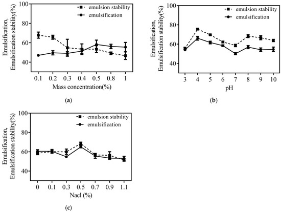 Figure 4c shows that the emulsification of CHC showed an increasing trend within 0.1–0.5% NaCl concentration, with high values of both emulsification and emulsion stability of CHC at 0.5% NaCl concentration. This may be because an increase in NaCl concentration weakens the attraction that collagen molecules have for one another, allowing salt solubility to occur and for oil droplets to adsorb on the collagen interface [5]. To increase the stability and emulsification of collagen, salt ions compress the thickness of the diffused bilayer as the concentration rises. This decreases the potential on the surface of the emulsion droplets, which lowers the repellent force barrier of the emulsion system and makes it easier for the droplets to aggregate, which reduces the stability and emulsification of collagen [3,38].