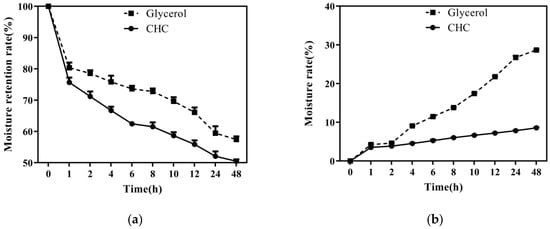 Humectancy and hygroscopicity curves of CHC. (a) Moisture absorption; (b) moisture retention.
