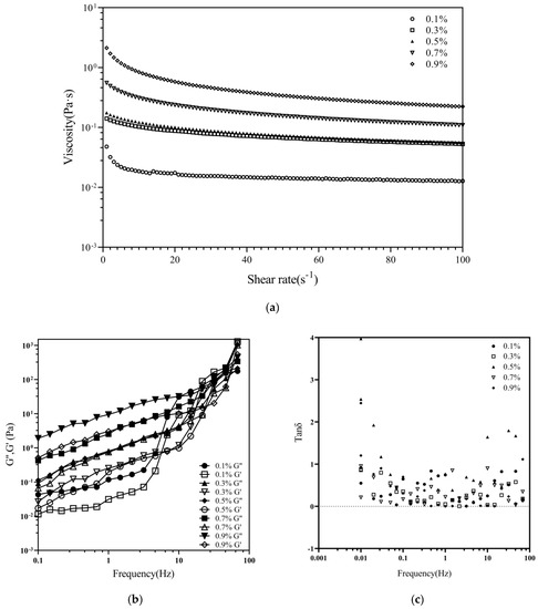 The steady-state viscosity of the CHC solution versus the shear rate is shown in Figure 6. The steady-state density of the CHC solution decreased with increasing shear rate but increased with increasing solution concentration. The more distributed chain particles roll and spin to compact into a group when the shear rate increases due to shear stress between the flow layers, lowering the number of physical cross-linking points and decreasing viscosity [5,42]. A total of 0.1–0.9% of the CHC solution showed typical mimetic plasticity (Figure 6a). The collagen molecules were entangled at low shear rates and formed more physical cross-linking sites, increasing the solution’s apparent viscosity [42]. Previous studies have reported that the higher the relative molecular mass of straight-chain polymer molecules, the higher the plasticity [16].