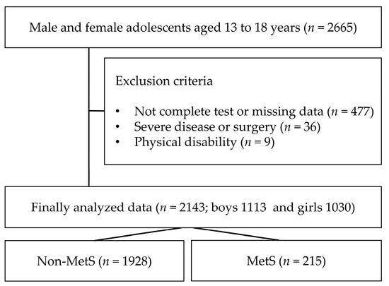 The Korea National Health and Nutrition Examination Survey is an annual health project conducted by the Centers for Disease Control and Prevention in Korea that includes all age groups across the country. Participation in the study was voluntary, and only data from those who consented to participate in testing, data analysis, and publication for research purposes were included. Exclusion conditions include people with a history of congenital disease, type 1 diabetes, cancer, or physical disability. In this study, 2143 middle- and high-school students (boys: 1113; girls: 1030) aged 13–18 years old surveyed from 2016 to 2021 were selected (Figure 1). Only data with completed questionnaires (PA, dietary habits, mental status, household income, smoking, and alcohol consumption), MetS, and obesity factors were analyzed. The participants were asked to complete the questionnaire, and the staff only provided assistance if the participant had difficulty understanding the sentence or had poor eyesight.