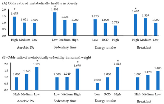 Figure 2B depicts the OR of MUNW for adolescents who were metabolically unhealthy despite having a normal weight. It increased 1.7 times in the low aerobic PA group, 1.6 times in the long sitting group, and 1.7 times in the high energy intake group. However, breakfast status did not significantly affect prevalence.