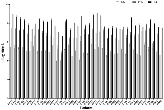 Average Log CFU/ml of C. jejuni isolates at 24 h when incubated micro-aerobically at 42 °C in BHI broth with shaking at 200 rpm. The results show the mean and standard deviation of the three independent replicates.