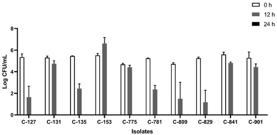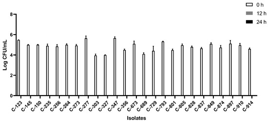 Average Log CFU/ml of aero-sensitive C. jejuni isolates at 0 h, 12 h, and 24 h time points in an aerobic condition. The results show the mean and standard deviation of the three independent replicates. These isolates did not survive 12 h and 24 h of aerobic exposure.