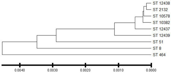 Dendrogram showing phylogenetic relationship between sequence type and isolates whose sequence type was novel. ST = sequence type. ST–12437, ST–12438, and ST–12439 are the new sequence types assigned by the Campylobacter PubMLST database. Evolutionary distances were computed using the p-distance method using the UPGMA method.