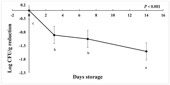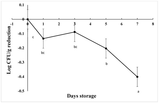 Reduction in C. jejuni counts when stored at 4 °C for 7 days (p < 0.001). Means with different letters are statistically different. The error bar represents the pooled standard error of the means.