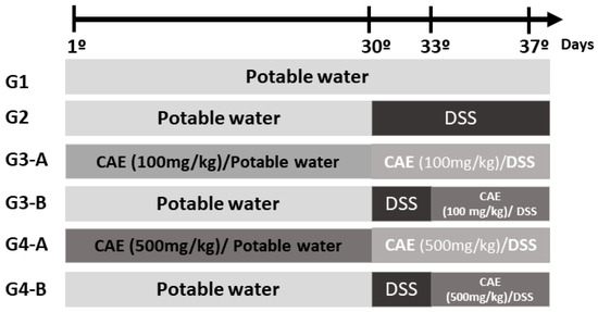 Treatment protocol during the DSS-induced acute colitis model. Animals: C57BL/6J female mice (8 weeks). Groups: G1 = 5 animals accommodated in one cage; G2–G4 = 5 animals per cage, totaling 7 cages (n = 7 animals/group). Treatments: G1 = drinking water ad libitum (satellite group); G2–G4 = dextran sulfate sodium group 3% (DSS, ad libitum, 30th to 37th experimental day); G3-A and G4-A = CAE at 100 and 500 mg/kg, respectively, from the 1st to the 37th experimental day; G3-B and G4-B = CAE at 100 and 500 mg/kg, respectively, from the 33rd to the 37th experimental day.