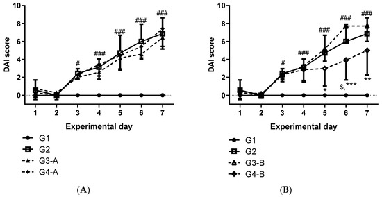 DAI evolution during DSS-induced colitis model in female C57BL/6J mice. (A) DAI evolution after 37-day CAE treatment at 100 (group G3-A) and 500 mg/kg (group G4-A); (B) DAI evolution after 4-day CAE treatment at 100 (group G3-B) and 500 mg/kg (group G4-B). Results expressed as mean ± standard deviation. Animals: female C57BL/6J mice (8 weeks). Groups: G1—satellite group; G2—DSS-challenge group; G3-A and G4-A—37-day dose-repeated CAE treatment at 100 and 500 mg/Kg, respectively, plus DSS challenge; G3-B and G4-B—4-day dose-repeated CAE treatment at 100 and 500 mg/Kg, respectively, plus DSS challenge. Statistical analysis by two-way ANOVA followed by Bonferroni’s test (# p < 0.05, ### p < 0.001 in comparison to the satellite group; $ p < 0.05 in comparison to DSS group; * p < 0.05, ** p < 0.01, *** p < 0.001 in comparison to 4-day CAE treatment at 100 mg/kg).