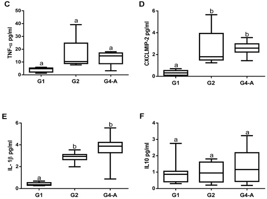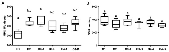 Biochemical analysis inflammatory evaluation in the mice’s colons in the DSS-induced colitis model. (A) Myeloperoxidase activity (MPO U/g tissue); (B) reduced glutathione level (GSH mmol/mg tissue); (C) concentration of TNF-α (pg/mL); (D) concentration of CXCL-MIP2 (pg/mL); (E) concentration of IL-1β (pg/mL); (F) concentration of IL-10 (pg/mL). Results expressed as a boxplot graphic. Animals: female C57BL/6J mice (8 weeks). Groups: G1—satellite group; G2—DSS-challenge group; G3-A and G4-A—37-day dose-repeated CAE treatment at 100 and 500 mg/Kg, respectively, plus DSS challenge; G3-B and G4-B—4-day dose-repeated CAE treatment at 100 and 500 mg/Kg, respectively, plus DSS challenge. Statistical analysis by ANOVA one-way followed by Tukey’s test (different letters indicate significant differences between groups, p ≤ 0.05).