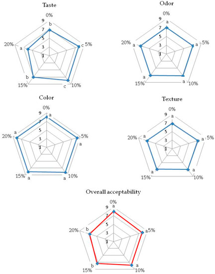 Results of the sensory evaluation of low-carbohydrate bread supplemented with walnut flour. Values designated in different letters are significantly different (α = 0.05).