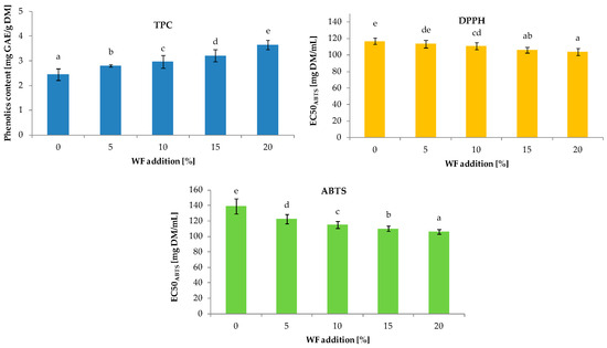 Enriching cereal products with various plant raw materials is a current trend. Such activities increase the nutritional and nutraceutical value of food. According to the data presented in Figure 3, WF contained approximately twofold higher total phenolics than control bread. Consequently, replacing basic flours with WF increased the phenolic content in the bread samples. The content of TPC in the enriched bread ranged from 2.45 to 3.65 for products with 5% and 20% of WF, respectively. The coefficient of correlation between the level of WF and TPC was 0.988 (p < 0.05). The increased phenolic content in the bread recipe resulted in higher antioxidant activity (AA) in the enriched bread. In both the ABTS and DPPH assays, WF decreased the EC50 index, indicating an increase in the antioxidant capacity of the enriched samples. However, in the case of ABTS antiradical activity, WF only slightly increased the AA of the bread, and the value of this index decreased with the addition of WF from 116.73 mg DM/mL (control bread) to 103.71 mg DM/mL (bread with 20% WF). On the other hand, in the case of the DPPH assay, the values changed within a wider range, from 139.91 mg DM/mL to 106.17 mg DM/mL, respectively. The correlation coefficients between WF content in bread and ABTS and DPPH were statistically significant (p < 0.05) and resulted in r = 0.991 and 0.955, respectively. Pycia and Ivanišová [16] obtained similar results when they incorporated WF into wheat bread. However, they noted higher levels of TPC in their enriched bread samples compared to the levels of phenolics in this study. This difference may result from the different methods of WF preparation. According to literature data from Santos et al. [47], the content of TPC in WF strongly depends on thermal treatment.