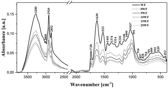 In order to analyze the samples of flour and flour with the addition of WF at the molecular level, FTIR spectroscopy measurements were performed. The processed spectra are presented in Figure 4.