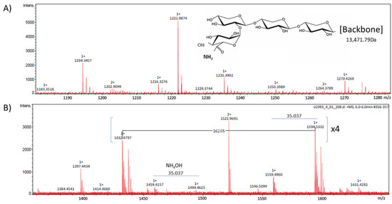 RP-HPLC-ESI-MS/MS analyses (‘m/z’ signals) of the LMWF. (A) Identification of the molecular weight corresponding to the protein backbone, and (B) identification of mass losses corresponding to the carbohydrate-based prosthetic group [9,16].