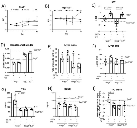 Body weight measures and biochemical parameters in mice administered with the LMWF (SETIs) or the qLF (Oil). (A–D) Body weight gain, hepatosomatic index (D), and liver mass (E), liver triglycerides (F), serum triglycerides (G), glycaemia (H) and the Tyg index (I) in high-fat diet (HFD)-fed Rag2-/- and Rag2-/-IL2-/- mice. Values for control animals under a high-fat diet are represented by dotted lines. Data are presented as mean ± SD (n = 4–6). * p < 0.05.