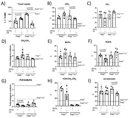 Hepatic major lipids profile in mice administered with the LMWF (SETIs) or the qLF (Oil). 1H-MAS MR levels of total lipids (A), mobile triglycerides-CH2 (B) and triglyceride-CH3 (C) and the CH2/Ch3 ratio (D). (E–I) Lipid patterns for PUFAs and MUFAs. Values for control animals under a high-fat diet are represented by dotted lines. Data are presented as means ± SD (n = 4–6). * p < 0.05.