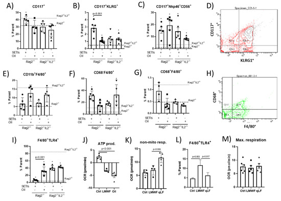Hepatic immunity in mice administered with the LMWF (SETIs) or the qLF (Oil). Immunephenotyping of hepatic infiltrated innate lymphoid (A–C), (D) typical FACS plot for the identification of ILCs. Immunephenotyping of hepatic infiltrated myeloid (E–G,I), (H) typical FACS plot for the identification of myeloid cells. Bioenergetic adaptations in human macrophage-like cells: (J), ATP production; (K), non-mitochondrial respiration; (L), immunephenotyping of HB8902 cells; and (M) maximal respiration. Values for control animals under a high-fat diet are represented by dotted lines. Data are presented as means ± SD (n = 4–6). * p < 0.05.