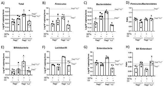 Gut microbiota in mice administered with the LMWF (SETIs) or the qLF (Oil). Microbiota composition of colon content determined by real-time PCR and expressed as log copy number of 16S rDNA gene per gram of feces. Colonic account of different bacterial phyla (A–H) in mice administered with the LMWF and qLF. Values for control animals under a high-fat diet are represented by dotted lines. Results are expressed as mean ± SD (n = 4–6).