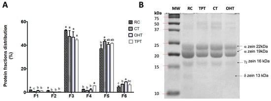 The protein profile and fraction distribution of raw corn and tortillas processed using traditional processing and ohmic heating. (A) The protein percentage of globulins and salt-soluble albumins (F1), albumins (F2), α-, β-, and δ-zeins (F3), γ-zeins and glutelin-like proteins (F4), glutelins (F5), and non-extractable (insoluble) protein residue (F6). RC: raw corn flour; CTs: commercial tortillas; TPTs: traditional-process tortillas; OHTs: tortillas processed using ohmic heating. (B) Electrophoretic profile of proteins (only F3 fraction is shown) showing the bands for α-, β-, and δ-zeins. Different letters indicate significant differences among groups for each protein fraction calculated using a Tukey test (p < 0.05).
