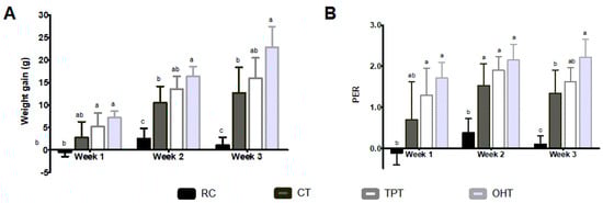 The weekly growth performance of each experimental group is depicted in Figure 3A. Rats fed with OHTs and TPTs had the greatest weight gain, followed by CTs. After three weeks, the OHT group gained 22.82 ± 5.37 g in total. This value was not statistically different from the 15.94 ± 4.54 g gained by the TPT group but was higher than the 12.72 ± 5.63 g increase in the CT group. During the experiment, rats from the casein group had normal growth with an average weight gain of 101.3 g/week.