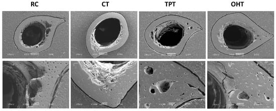 Scanning electron microscopy images showing transverse cuts of femurs from rats fed with different tortilla diets. RC: raw corn flour; CTs: commercial tortillas; TPTs: traditional process tortillas; OHTs: tortillas processed using ohmic heating.