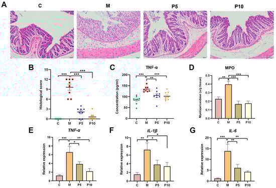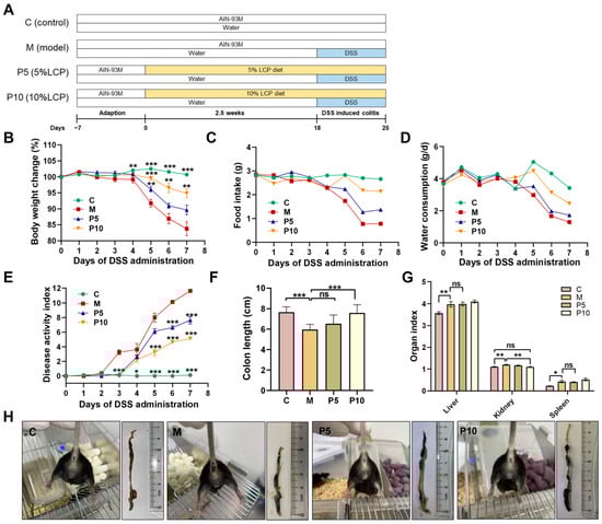 Male C57BL6/J mice (22 ± 1 g, 6 weeks) were purchased from GemPharmatech (Beijing, China). These animals were accommodated in a specific pathogen-free environment at the Laboratory Animal Center of Jiangnan University (license no. SYXK (Su) 2021-0056, Wuxi, China) under controlled humidity (40–70%) and temperature (20–26 °C), with a 12-h light/dark cycle. Jiangnan University Experimental Animal Management and Animal Welfare Ethics Committee reviewed and approved the animal study (JN. No. 20211215c0600128 [532]). The experimental protocols were as follows (Figure 1A): mice were acclimatized for one week with sterile water and standard diets (AIN-93M) prior to being randomly assigned to four groups (eight mice/group): (1) control group fed with AIN-93M diet (C), (2) colitis model group fed with AIN-93M diet (M), (3) AIN-93M diet supplemented with 5% LCP (P5), and (4) AIN-93M diet supplemented with 10% LCP (P10). On days 18–25, the drinking water of all groups, except the control group, was replaced with a 2.5% (w/v) DSS aqueous solution to induce colitis [33]. Fecal samples were collected on day 25, and the mice were subsequently sacrificed following a 12-h fast. Colon length was measured before collection into sterile tubes. Organ indexes were calculated using the formula: organ index = organ weight (g)/body weight (g) × 100%. Colon tissues were promptly frozen in liquid nitrogen following the retrieval of 1 cm tissues for hematoxylin and eosin (H&E) staining.