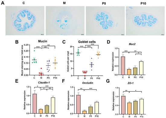 To assess the potential beneficial impact of the LCP diet on the conservation of the intestinal barrier, the mucin of colon tissue sections was initially stained with AB-PAS. Compared with the C group, the mucin staining area in the M group was reduced 8.3-fold, whereas the staining area in the P5 and P10 groups was restored to normality (Figure 3A,B). Muc2 gene expression was markedly elevated in the P10 group compared to the M group (Figure 3D). Goblet cells, which secrete mucus in the intestinal crypts to form a protective mucus barrier, were counted, revealing a 7.2-fold decrease in the colitis mice compared to healthy mice. Conversely, the P5 and P10 groups restored the depletion of goblet cells 3.5- and 6.7-fold, respectively (Figure 3C). Tight junctions (TJs), comprising claudins, occludin, and zonula occluden (ZO) proteins, constitute an essential mechanical barrier within the intestinal tract [35]. In colon tissue, the gene expressions of Claudin-1, Occludin and ZO-1 proteins were considerably suppressed in colitis mice but markedly increased in the P10 group (Figure 3E–G).