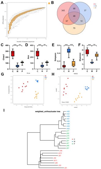 Here, we selected the samples of the P10 group for 16S rRNA gene sequencing. A species accumulation curve, which was delineated based on the number of samples and species OTUs, demonstrated no substantial increment in species as the sample quantity expanded, thereby indicating that the sample volume was adequate for reflecting species richness (Figure 4A). A Venn diagram visually displayed the overlay of OTUs among groups, revealing 343, 37, and 79 various microbes in the C, M, and P groups, respectively, with 48 overlapping microbes observed among them (Figure 4B). The M group displayed a diminished OTU count relative to the C and P groups. Both community richness and diversity indexes, as determined by Chao1, Ace, Simpson, and Shannon, were included in the α-diversity analysis. The results revealed significant suppressions in the richness and diversity of the M group. Conversely, the LCP diet distinctly ameliorated these metrics, exhibiting a diversity nearly analogous to the C group (Figure 4C–F). The results of Principal Coordinates Analysis (PCoA) and Non-metric Multidimensional Scaling (NMDS) revealed distinct clustering separations among the C, M, and P groups, manifesting disparate gut microbiota structures (Figure 4G,H). The UPGMA cluster tree showed that the C group and DSS administration groups (M and P groups) were located on distinct branches, thus possessing different microbial compositions. The M and P groups were relatively clustered, on two branches (Figure 4I).