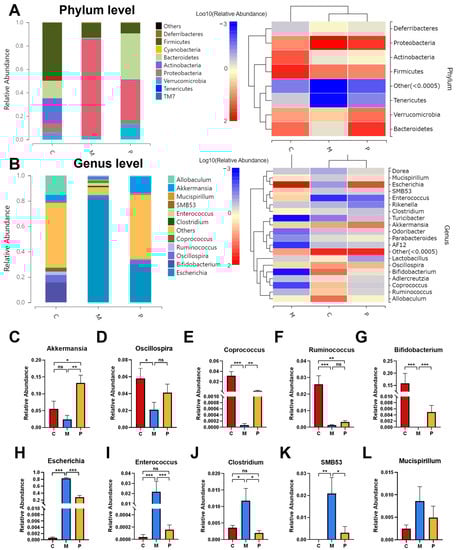 Subsequently, we investigated the alternations in gut microbiota compositions consequent to the administration of DSS and the LCP diet. The most abundant phyla include Firmicutes, Bacteroidetes, Actinobacteria, Proteobacteria, and Verrucomicrobia. At the phylum level, Proteobacteria and Deferribacteres manifested a drastic elevation in colitis mice, augmented 10.7- and 3.5-fold compared to the healthy group, whereas Firmicutes, Actinobacteria, Bacteroidetes, and Tenericutes significantly dropped, 3.9-, 41.3-, 32.1-, and 150.4-fold (Figure 5A,B). In comparison to the M group, the LCP diet remarkably reduced Proteobacteria 2.3-fold, while increasing Bacteroidetes and Verrucomicrobia 83.7- and 5.5-fold. At the genus level, the abundance of Escherichia, Enterococcus, and Clostridium were 1334.7-, 558.6- and 3.3-fold higher in colitis mice than in healthy mice, but 2.9-, 136.8-, and 5.9-fold lower than in the P group (Figure 5H–J). SMB53, undetectable in the C group, was extremely elevated in colitis mice and significantly declined in the P group (Figure 5K). Following DSS administration, genera such as Oscillospira, Coprococcus, Ruminococcus, and Bifidobacterium, were decreased 2.8-, 456.9-, 20.2- and 7950.2-fold compared to the C group, a phenomenon partly reversed by the P group (Figure 5D–G). A reduction in Mucispirillum was observed in the P group compared to the M group, although without statistical significance. Interestingly, no substantial difference in Akkermansia between the C and M groups was observed; however, Akkermansia was 5.5- and 2.4-fold higher in the P group compared to the C and M groups (Figure 5C).