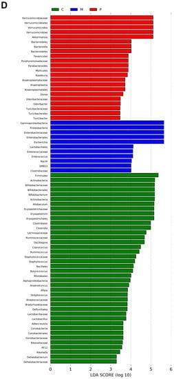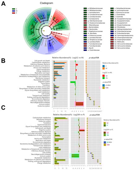 Effects of LCP on dominant microorganisms and functional difference analysis. (A) Taxonomic cladogram. (B,C) Differential pathways among the C, M and P groups using two-sided Wilcox test at p < 0.05. (D) Linear discriminant analysis (LDA) histogram with the score above 2.
