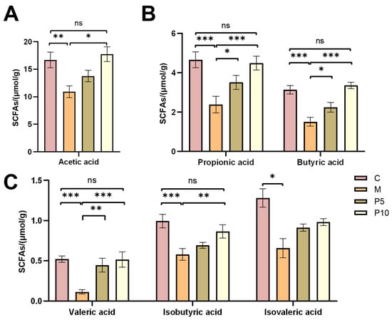 SCFAs, produced by microbial fermentation, are posited to confer advantageous effects on colonic homeostasis. We quantified six SCFA levels in the intestinal contents of each group. The DSS administration manifested a decrease in all SCFA levels (Figure 7). Conversely, the LCP diet led to an increase in the SCFA levels in colitis mice, and, except for isobutyric acid, the levels of SCFAs in the P10 group reverted to those in the C group.