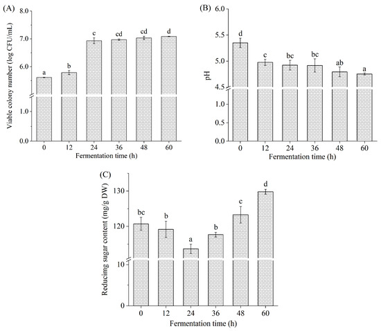 Viable colony number (A), pH (B), and reducing sugar content (C) during L. brevis fermentation. Different lowercase letters represent significant differences (p < 0.05).