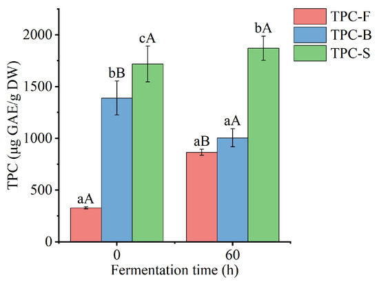 Free, bound, and the sum of free and bound TPC of Betaphycus gelatinum substrate fermented by L. brevis for 0 h and 60 h. TPC-F: free TPC; TPC-B: bound TPC; TPC-S: the sum of free and bound TPC; Different lowercase letters within the group represent significant differences (p < 0.05). Different capital letters between 0 h and 60 h represent significant differences (p < 0.05).