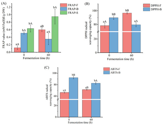 FRAP value (A), DPPH radical scavenging capacity (B), and ABTS radical scavenging capacity (C) of free and bound polyphenol extracts of Betaphycus gelatinum substrate fermented by L. brevis for 0 h and 60 h. FRAP–F: FRAP of free polyphenol extracts; FRAP–B: FRAP of bound polyphenol extracts; DPPH–F: DPPH radical scavenging capacities of free polyphenol extracts; DPPH–B: DPPH radical scavenging capacities of bound polyphenol extracts; ABTS–F: ABTS radical scavenging capacities of free polyphenol extracts; ABTS–B: ABTS radical scavenging capacities of bound polyphenol extracts. Different lowercase letters within the group represent significant differences (p < 0.05). Different uppercase letters between 0 h and 60 h represent significant differences (p < 0.05).