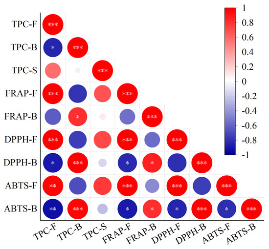 Heatmap of the correlation among the free, bound, and sum of free and bound TPC and antioxidant activity of Betaphycus gelatinum substrate fermented by L. brevis for 0 h and 60 h. TPC: total phenolic content; TPC–F: free TPC; TPC–B: bound TPC; TPC–S: the sum of free and bound TPC; FRAP–F: FRAP of free polyphenol extracts; FRAP–B: FRAP of bound polyphenol extracts; DPPH–F: DPPH radical scavenging capacities of free polyphenol extracts; DPPH–B: DPPH radical scavenging capacities of bound polyphenol extracts; ABTS–F: ABTS radical scavenging capacities of free polyphenol extracts; ABTS–B: ABTS radical scavenging capacities of bound polyphenol extracts. * Correlation is significant at the 0.05 level; ** Correlation is significant at the 0.01 level; *** Correlation is significant at the 0.001 level.