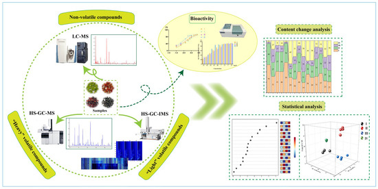 HPLC-grade acetonitrile and methanol were obtained from Fisher (Fair Lawn, NJ, USA), and formic acid was obtained from ACS (Wilmington, DE, USA). Experimental water was purchased from Watsons Trademark Co., Ltd. (Hong Kong, China). The reference standards of protocatechuic acid (CAS: 99-50-3), caffeic acid (CAS: 331-39-5), gallic acid (CAS: 149-91-7), quercetin (CAS: 117-39-5), taxifolin (CAS: 480-18-2), chlorogenic acid (CAS: 27-97-9), astragaloside (CAS: 480-10-4), isoquercetin (CAS: 21637-25-2), rutin (CAS: 153-18-4) and sangone G (CAS: 75629-19-5) were provided by Shanghai Yuanye Bio-technology Co., Ltd. (Shanghai, China). The standard mixture N-ketone C4-C9 for calculating the retention index (RI) of HS-GC-IMS was purchased from Sinopharm Chemical Co., Ltd. (Shanghai, China), and the normal alkane C8-C20 of GC-MS was purchased from Sigma Aldrich Chemical Co., Ltd. (St. Louis, MO, USA).