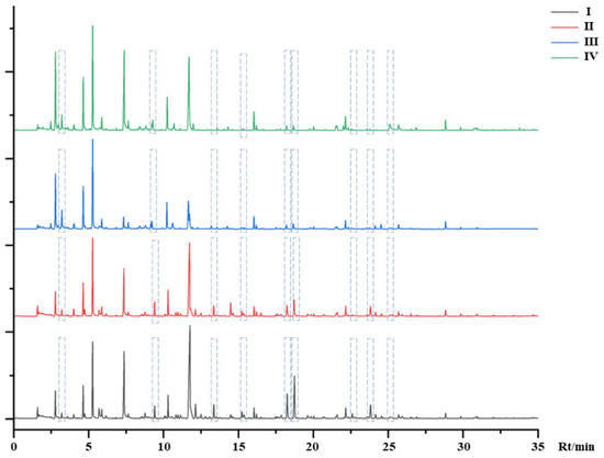 The TIC of mulberry samples in different stages is shown in Figure 2. I to IV were mulberry fruits that grew from immature to mature. Some different VOCs are marked in Figure 2. It can be seen from the figure that the difference was not only in the content of VOCs, but also in the type of VOCs. A total of 64 compounds were identified according to the retention index, matching value, and literature reference in Table 2. It is worth noting that 16 kinds of VOCs (hexanal; n-hendecane; p-xylene; dodecane; hex-2-enal; trans-2-hexenal; 2-pentylfuran; p-cymene; 1, 2, 4-trimethylbenzene; n-tridecane; 1-nonanal; 5-ethyl-1-cyclopentene-1-carboxaldehyde; (E)-2-octenal; 1-octen-3-ol; β-cyclocitral and phenylacetaldehyde) existed in the whole process of mulberry growth, 14 kinds (2-ethyl toluene; m-cymene; cyclohexene; 2-heptenal; 6-methyl-5-hepten-2-one; α, p-dimethylstyrene; acetic acid; trans, trans-2, 4-heptadienal; linalool; (−)-isocaryophyllene; cis-5-octen-1-ol; α-farnesene and jasmone) existed in stage I, seven kinds (valeraldehyde, o-cymene, decyl aldehyde, n-pentadecane, 3-heptylacrolein, decyl alcohol and phenethyl alcohol) existed in stage II, one kind (irisone) existed in stage III, and two kinds ((2E, 4Z)-decadienal and hexanoic acid) existed in stage IV. The remaining VOCs existed in several of them. Moreover, it could be clearly seen that VOCs were gradually decreasing with the maturity of the mulberry fruit from the identified VOCs.