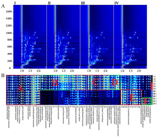 (A): 2D top views of mulberry samples detected by HS-GC-IMS; (B): the fingerprints of 12 samples (three in each stage); I–IV are samples of mulberry at different mature stages. The ABCDEF region in (B) is a division of differential components, which is detailed in the text.