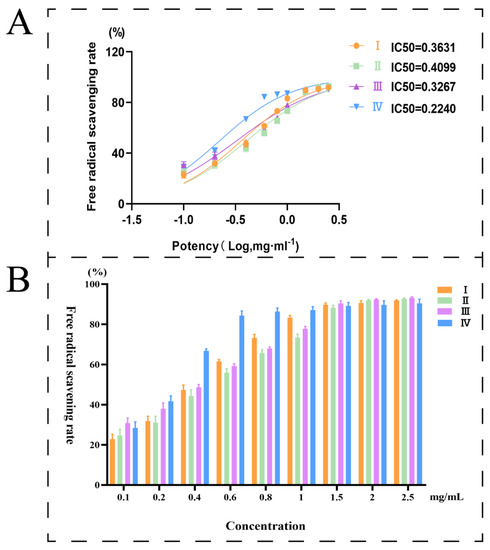 (A): Free radical scavenging rate of DPPH; (B): IC50 for different stages.
