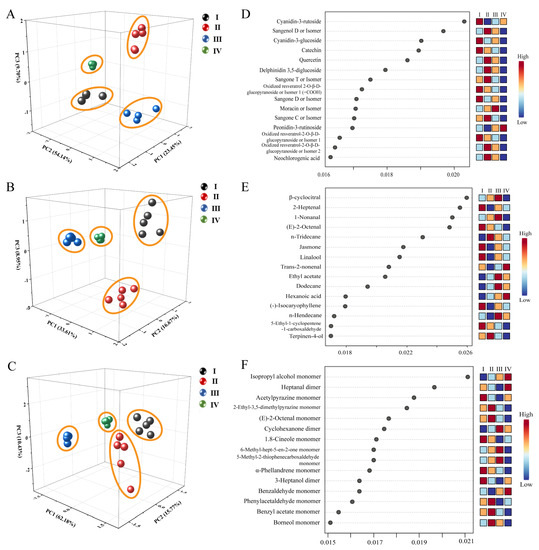 RFA was performed using metaboanalyst 5.0 (https://www.metaboanalyst.ca/ (accessed on 11 July 2023)). RFA is a supervised statistical analysis method that does not require dimensionality reduction of the data because it can handle data in very high dimensions. No feature selection was performed at the same time because feature subsets were randomly selected. Insensitivity to missing values was one of its advantages. Accuracy was maintained even when a significant fraction of the features were missing. The characteristic components with an RFA score value higher than 0.018 were selected for analysis in the three analyses. It is noteworthy that in the UPLC-Q-Orbitrap-MS analysis (Figure 5D), cyanidin-3-rutoside, cyanidin-3-glucoside, and catechin were the characteristic components in stage I, and sangenol D was the most specific in stage II. In the HS-SPME-GC-MS analysis (Figure 5E) and the HS-GC-IMS analysis (Figure 5F), 2-geptenal, (E)-2-octenal, jasmone, linalool, and acetyl pyrazine monomer were the characteristic components of phase I; n-tridecane and 2-ethyl-3,5-dimethylpyrazine monomer were the characteristic components of phase II; β-cyclocitral, 1-nonanal, ethyl acetate, and dodecane were the characteristic components of phase III; and trans-2-nonenal, isopropyl alcohol monomer, and heptanal dimer were the characteristic components of phase IV.