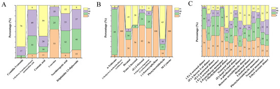 (A–C): Percentage of component content measured by UPLC-Q-Orbitrap-MS, HS-SPME-GC-MS, and HS-GC-IMS, respectively.