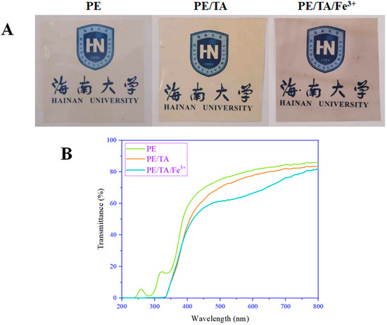 Appearance images (A) and UV–visible transmission spectra (B) of PE, PE/TA and PE/TA/Fe3+ films. PE: pectin, PE/TA: pectin/tannic acid, PE/TA/Fe3+: pectin/tannic acid/Fe3+.