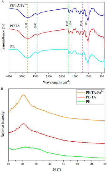 FTIR (A) and X_crystal diffraction structure (B) analysis of PE, PE/TA and PE/TA/Fe3+ films. PE: pectin, PE/TA: pectin/tannic acid, PE/TA/Fe3+: pectin/tannic acid/Fe3+.