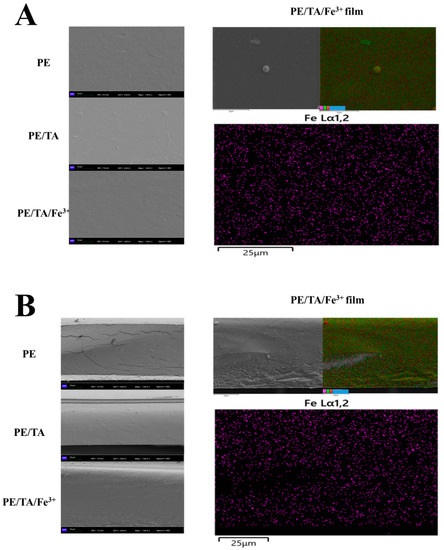 The microstructure of the PE film was mainly analyzed and observed by scanning electron microscopy (SEM), as shown in Figure 3A, which presents the surface microstructure of the PE composite film at 1500× magnification. All PE films exhibit a relatively flat and uniform surface microstructure due to the excellent film-forming properties of PE. Figure 3B shows the cross-sectional microstructure of the PE films. At 1000× magnification, a large number of cracks and voids were observed in the cross-sectional microstructure of the pure PE films. However, with the addition of TA and Fe3+, the voids and cracks in the PE films were significantly reduced, and a continuous, dense and flat cross-sectional structure was observed in the PE/TA/Fe3+ films. This indicates that TA and Fe3+ are capable of crosslinking with each other and improving the loose structure between PE molecules. Specifically, TA not only crosslinks with PE molecules but also further reduces the discontinuous molecular arrangement of PE through the metal–phenol supramolecular network structure with Fe3+, which significantly improves the degree of crosslinking between PE molecules, resulting in the formation of a dense and compact network structure. Similarly, another study observed that the loose and porous cross-sectional structure of PE films became dense and homogeneous when PE films were crosslinked with Fe3+ [9]. Additionally, the surface and cross-sectional microstructures of PE in Figure 4 show that Fe3+ is uniformly distributed in the PE film, indicating that Fe3+ and PE molecules are uniformly dispersed inside the PE film through crosslinking with each other. This phenomenon is consistent with the study of Bai et al. [19].