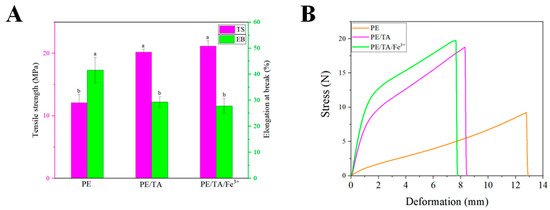 Tensile strength and elongation at break are well-known indicators for evaluating the mechanical properties of food packaging films and are highly correlated with film structure. Figure 4A presents the tensile strength and elongation at break of pure PE films and PE composite films, while the corresponding stress–strain curves are shown in Figure 4B. It can be observed that among the pure PE films, the tensile strength is the lowest, measuring 12.103 MPa, while the elongation at break is the highest, at 41.59%. With the addition of TA and Fe3+, the mechanical properties of the PE films were significantly improved. The tensile strength of the PE/TA film and PE/TA/Fe3+ film improved by 40.14% and 42.85%, respectively, compared to the pure PE film. This improvement can be mainly attributed to the ability of tannins to crosslink with PE molecules, resulting in a denser structure of the PE films. Additionally, Fe3+ can form a tight metal–phenol network structure with TA and crosslink with PE molecules, forming an “egg carton” model that significantly enhances the mechanical properties of the PE films [9]. The microstructure of the PE films also confirms that the addition of TA and Fe3+ leads to a more compact and dense structure of PE. Similarly, Zhao et al. [4] reported that the tensile strength of films could be significantly improved by incorporating TA into chitosan–corn starch films. The authors explained that TA can react with chitosan molecules in a Schiff base reaction, forming covalent bonds that enhance the rigid structure of the film. Additionally, intermolecular forces such as hydrogen bonding interactions and electrostatic interactions that may exist between PE molecules and TA could also be important in improving the mechanical properties of the PE films.