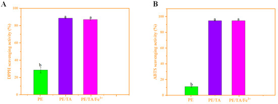 DPPH scavenging capacity (A) and ABTS scavenging capacity (B) of PE, PE/TA and PE/TA/Fe3+ films. PE: pectin, PE/TA: pectin/tannic acid, PE/TA/Fe3+: pectin/tannic acid/Fe3+. Superscript letters with the same column represent the test of significance difference between the data of each treatment group, letters with the same letter indicate that there is no significant difference in Duncan’s Multiple Ranges (p > 0.05).