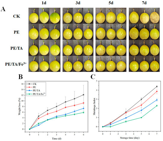 It is well known that passion fruit is a typical climacteric fruit [35]. After harvesting, passion fruit experiences accelerated water loss and rapid skin wrinkling. The change in the appearance of passion fruit over a period of 7 days is shown in Figure 6A. In the control group (CK), obvious wrinkling appeared on the 3rd day, and with time, the wrinkling of the passion fruit worsened until the 7th day when the fruit in the CK group became rotten, deteriorated and unfit for consumption. In contrast, the appearance of passion fruit treated with the PE composite coating was significantly improved. Passion fruit treated with pure PE coating showed wrinkles on the 5th day, the PE/TA composite coating showed wrinkles on the 7th day, and the PE/TA/Fe3+ composite coating showed the best effect, with minimal or no wrinkles observed during the 7-day period. Additionally, the weight loss of passion fruit increased linearly during the 7-day storage period. As shown in Figure 6B, the untreated passion fruit had the highest weight loss of about 12.17%, whereas the passion fruit treated with the PE composite coating exhibited significantly lower weight loss. The passion fruit treated with the PE/TA/Fe3+ composite coating showed the lowest weight loss at approximately 5.98%. This observation is predictable since the PE/TA/Fe3+ composite coating has the lowest water vapor permeability (WVP), providing excellent barrier properties and minimizing water loss, thus maintaining the quality of the passion fruit [36]. Similarly, Zhou et al. [15] treated purple-skinned passion fruit with a chitosan/TA composite coating, and the coated fruit showed an 8.03% reduction in weight loss after 21 days of storage compared to the control group. The shrinkage index of passion fruit is also an important indicator for evaluating its quality. As shown in Figure 6C, the untreated passion fruit exhibited a sharp increase in shrinkage index during the 7-day period. Passion fruit treated with the PE composite coating showed a significantly lower shrinkage index compared to the control group. There was no significant difference in the wrinkling index between passion fruit treated with the pure PE coating and passion fruit treated with the PE/TA composite coating in the first 3 days. However, the pure-PE-coated passion fruit gradually developed wrinkles over time and showed wrinkling and black spots after 7 days of storage. Notably, passion fruits treated with the PE/TA/Fe3+ composite coating retained good fruit quality after 7 days of storage and had the lowest wrinkling index, indicating they were still of some food value. This result aligns with the study conducted by Zhou et al. [15]. The PE/TA/Fe3+ coating could influence the anaerobic respiration and fruit metabolism inside the passion fruit. Therefore, the PE composite coating treatment significantly delays the senescence and spoilage of passion fruit, improving its appearance quality and commercial value.