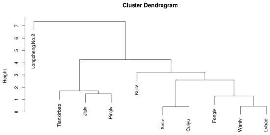 Cluster analysis results can better reflect the characteristics of organic acid substances in the different A. arguta wine samples (Figure 2). Based on the organic acid cluster analysis of each variety, it can be seen that the ten A. arguta wine samples can be classified into three categories when the value of the transverse tangent line is taken as four. The first category includes ‘Longcheng No.2’; the second category includes ‘Tianxinbao’, ‘Jialv’, and ‘Pinglv’; and the third category includes ‘Kuilv’, ‘Xinlv’, ‘Cuiyu’, ‘Fenglv’, ‘Wanlv’, and ‘Lvbao’, indicating that when the crosscut line takes a value of four, each class contains samples similar organic acids. Thus, the results also better clustered the different types of A. arguta wines together.