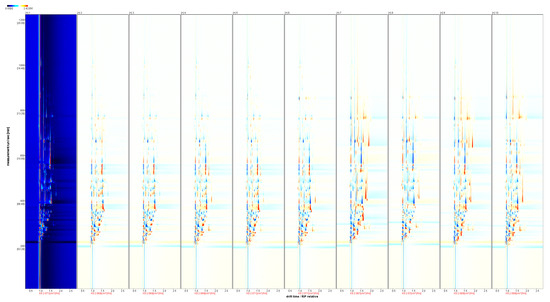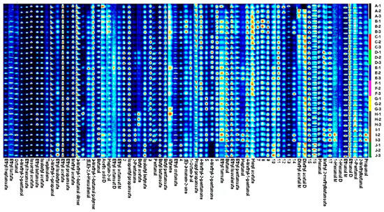 Taking the ‘Kuilv’ variety as a reference, the rest of the spectrum is subtracted from the signal peaks in ‘Kuilv’ to obtain the difference spectrum (Figure 5). The blue area indicates that the amount of substance in a sample is lower than in ‘Kuilv’, and the red area indicates that the amount of substance in a sample is higher than in ‘Kuilv’. Again, the darker the color, the greater the difference. The difference spectrum in Figure 6 shows that the ethyl isovalerate, diethyl acetal M, and acetic acid D contents were higher in ‘Kuilv’ than in other varieties.