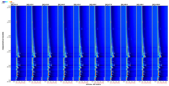 The volatile flavor substances of fruit wines mainly come from the fruit itself, yeast fermentation, and aging processes []. Aroma substances are indispensable indicators for evaluating the quality of fruit wines, and together, these volatile flavor substances, through the enrichment effect, provide A. arguta wines with a rich and unique flavor. Headspace gas chromatography–ion mobility spectrometry (HS-GC-IMS) is a commonly used method for separating and quantifying aroma substances in food.