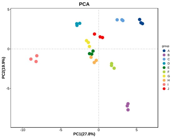PCA analysis of aromatic compounds of ten A. arguta wine samples. Note: Letters from A to J refer to ‘Kuilv’, ‘Fenglv’, ‘Jialv’, ‘Wanlv’, ‘Xinlv’, ‘Pinglv’, ‘Lvbao’, ‘Cuiiyu’, ‘Tianxinbao’ and ‘Longcheng No.2’, respectively.